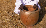 The space between the two pots is filled with wet sand. The inner pot can be filled with fruit, vegetables or drinks. A wet cloth covers the whole cooling system.