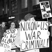| Demonstrators outside Chicago's Blackstone Hotel, February 5, 1970, to protest the visit of President Richard Nixon |