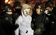 | Police officers arrest an Occupy Los Angeles protestor at the encampment at city hall November 30, 2011 in Los Angeles |