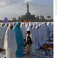 | Indonesian Muslims take part in a special morning prayer near Bajrah Sandhi Hindu's temple in Denpasar on Bali island, 01 Oct 2008 |