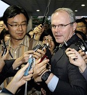 | Christopher Hill, right, is surrounded by reporters upon arrival at Foreign Ministry2 in Seoul, 03 Oct 2008 |
