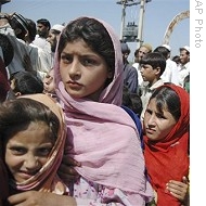| People queue for food at a refugee camp set up for displaced villagers, in Charsadda near Peshawar, 19 Sep 2008 |