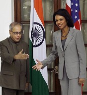 | US Secretary of State Condoleezza Rice shakes hands with Indian Foreign Minister Pranab Mukherjee in New Delhi, 04 Oct 2008 |