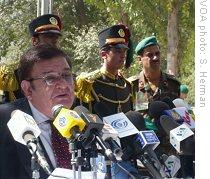 | Afghan Defense Minister Abdul Rahim Wardak speaking at a news conference at Ministry4 of Defense in Kabul, Sunday, 05 Oct. 2008 |