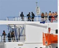 | A US Navy photo shows some of the Somali pirates and crew members of MV Faina off Somalia's Indian Ocean coast, 5 Oct. 2008 |