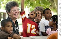 | Brenda Eheart (left) with children and a senior resident of Hope Meadows |