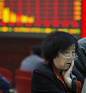 | A woman looks on at a stock brokerage in Beijing, China, 06 Oct 2008 |