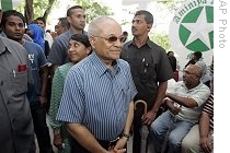 | Maldivian President Mamoun Abdul Gayoom, center, and his wife Nazreena Ibrahim wait for their turn to vote at a polling station in Male, Maldives, 08 Oct 2008 |