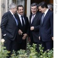 | From left: European Central Bank president Jean-Claude Trichet, French President Nicolas Sarkozy, British PM Gordon Brown, and EU Commission President José Manuel Barroso, in Paris, 12 Oct 2008 |
