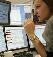 | A trader checks screens on London stock market movements shortly after it opened for business in London, 13 Oct 2008 |