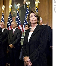 | House Speaker Nancy Pelosi (r) at a news conference following an economic forum5 with Democratic leaders and economic experts, 13 Oct 2008 |