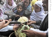 | Pakistani people receive donated food in a food distribution center on eve of the World Food Day in Lahore, Pakistan, 15 Oct. 2008 |