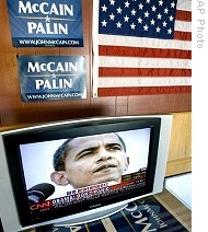 | Democratic presidential candidate Barack Obama on television at the John McCain campaign office in Provo, Utah, 08 Oct 2008 |