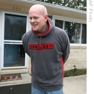 | Sam Joe Wurzelbacher laughs while chatting with the press outside of his home in Holland, Ohio, 16 Oct 2008 |