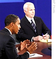 | Senators Barack Obama (l) and John McCain debating at Hofstra University in New York, 15 Oct 2008 |