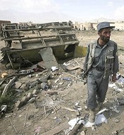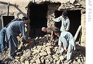 | Afghans check the debris9 of a house destroyed during an attack by Taliban militants10 in Lashkar Gah, the provincial capital of Helmand province, 15 Oct 2008 |