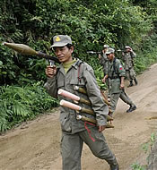 | Cambodian soldiers patrol on the road up to the famed Preah Vihear temple near Thai border, 16 Oct 2008 |