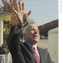 | Sen. John McCain waves to supporters as he leaves a campaign rally in St. Charles, Missouri, 20 Oct. 2008 |