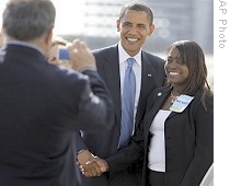 | Sen. Barack Obama poses for a picture with a supporter on the tarmac at the airport in Tampa, Florida, 20 Oct. 2008 |