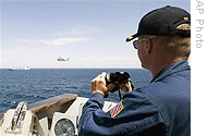 | An officer of a U.S. Navy guided- missile cruiser monitoring the hijacked10 Ukrainian cargo11 ship MV Faina in the Indian Ocean off the coast of Somalia, 30, Sept. 2008 |