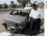 | An Iraqi policeman inspects a car destroyed September 16, 2007 by a Blackwater security detail in Baghdad, (file) |