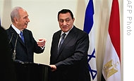 | Israeli President Shimon Peres (L) and his Egyptian counterpart Hosni Mubarak at a joint6 press conference after their meeting in Sharm el-Sheikh, 23 Oct., 2008 |