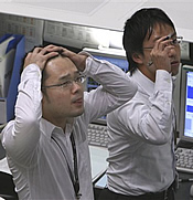 | Traders on the Tokyo Stock Exchange gaze at digital indicator5 as Japan's key stock index nose-dives on a rising yen6 and growing recession fears in Tokyo, 24 Oct 2008 |