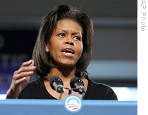 | Michelle Obama speaks to supporters at a rally in Columbus, Ohio, 24 Oct. 2008 |