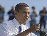 | Sen. Barack Obama speaks at a rally under the Gateway7 Arch at Jefferson National Expansion Memorial in St. Louis, 18 Oct. 2008 |