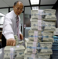 | A South Korean bank clerk works next to bundles of U.S. banknotes at the head office of Korea Exchange Bank at downtown of Seoul, South Korea, 10 Oct 2008 |