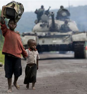 | Two boys, fleeing from the town of Kibumba, walk as a Congolese army tank moves on the road, about 35 kilometers north of Goma, 27 Oct 2008 |