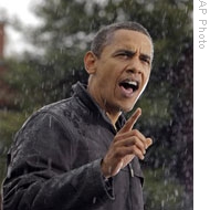 | Democratic presidential candidate Sen. Barack Obama addresses supporters in rain at a rally in Chester, Pennsylvania, 28 Oct 2008 |