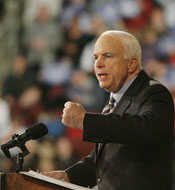 | Republican presidential candidate Sen. John McCain urges his supporters to 'stand up and fight' at conclusion of his campaign rally in Hershey, Pennsylvania, 28 Oct 2008 |