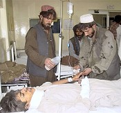 | Family members stand near man who was injured in earthquake, at local hospital in Quetta, 29 Oct 2008 |