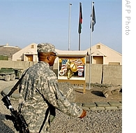 | A US soldier walks through compound at Forward Operating Base Salerno on outskirts16 of Khost, Afghanistan (file) |