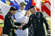 | Gen. David Petraeus, left, shakes hands with outgoing head U.S. Army Lt. Gen. Martin Dempsey in Tampa, Fla., 31 Oct. 2008 |