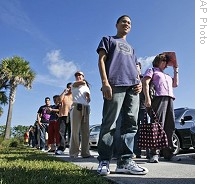 | First-time-voter Christopher Chin-Sang stands in line with others to vote early in Pembroke Pines, Florida, 2 Nov. 2008 |