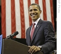 | Sen. Barack Obama smiles while speaking at a rally at Veteran's Memorial Arena5 in Jacksonville, Florida, 3 Nov. 2008 |