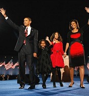 No longer just a first-term senator from Illinois, now President-elect Obama appeared with his wife Michelle and their two daughters, along with family members and Vice2 President-elect Joseph Biden before tens of thousands of people in Chicago's Grant Park.