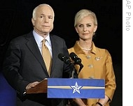 | Sen. John McCain with wife Cindy, delivers remarks during an election night rally in Phoenix6 4 Nov. 2008 |