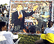 | People sit near a painting featuring U.S. Presidential candidate Barack Obama, during a gathering of people in Kogelo village, Kenya, 04 Nov 2008 |