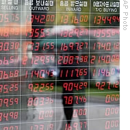 | A South Korean man is reflected on an electronic screen displaying foreign exchange rates at the head office of Korea Exchange Bank, Seoul, South Korea, 10 Nov 2008 |