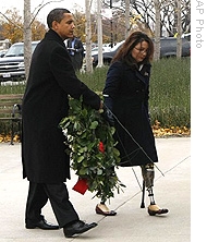 | President-elect Obama (l) and Iraq war veteran Tammy Duckworth, director, Illinois Department of Veterans Affairs lay a wreath at the Bronze Soldiers Memorial in Chicago, 11 Nov 2008 |