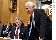 | Senate Banking6 Committee Chairman Sen. Christopher Dodd, right, greets Sen. Tim Johnson, on Capitol Hill, 13 Nov 2008 |