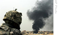 | A U.S. soldier watches as black smoke rises in the city of Mosul, northwest of Baghdad, 14 Nov 14 2008 |