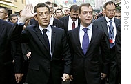 | Nicolas Sarkozy, left, and Dmitry Medvedev walk in Nice during the EU-Russia summit, 14 Nov 2008 |