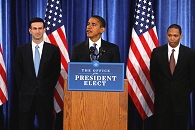 | President-elect Barack Obama, flanked, by Budget Director-designate Peter Orszag, left, and Deputy Budget Director-designate Rob Nabors in Chicago, 25 Nov. 2008 |