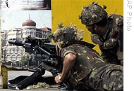 | Indian soldiers aim a grenade launcher at part of the facade2 of the Taj Mahal hotel in Mumbai,28 Nov 2008 |