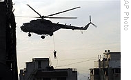 | An Indian commando comes down a rope to reach the top of Nariman House, 28 Nov 2008 |