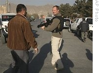 | A German security man stands guard after a suicide attack on a German Embassy vehicle in Kabul, Afghanistan, Sunday, 30 Nov. 2008 |